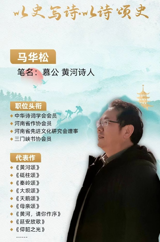 马华松,笔名慕公,中华诗词学会会员,中国散文学会会员,中华诗词学会科创诗词工委专家委员,河南省作协会员,京忠智库领袖联盟(京忠智库)研究员,创作诗歌有:唱响幸福河“六部曲”《黄河颂》《秦岭颂》《砥柱颂》《大坝颂》《天鹅颂》《母亲颂》,文化产业“三部曲”,礼赞天鹅“三部曲”,大美三门峡“三部曲”,老字号“三部曲”,歼疫“三部曲”等,出版诗集《黄河颂歌》。近百位专家、学者为其诗歌和诗集撰写评论,近百位书法艺术家将其诗歌创作成书法作品,上百家媒体平台推介 刊 播 发其诗作,成千上万的大中小学 幼儿园师生和诵读爱好者、诵读平台吟诵其诗作。