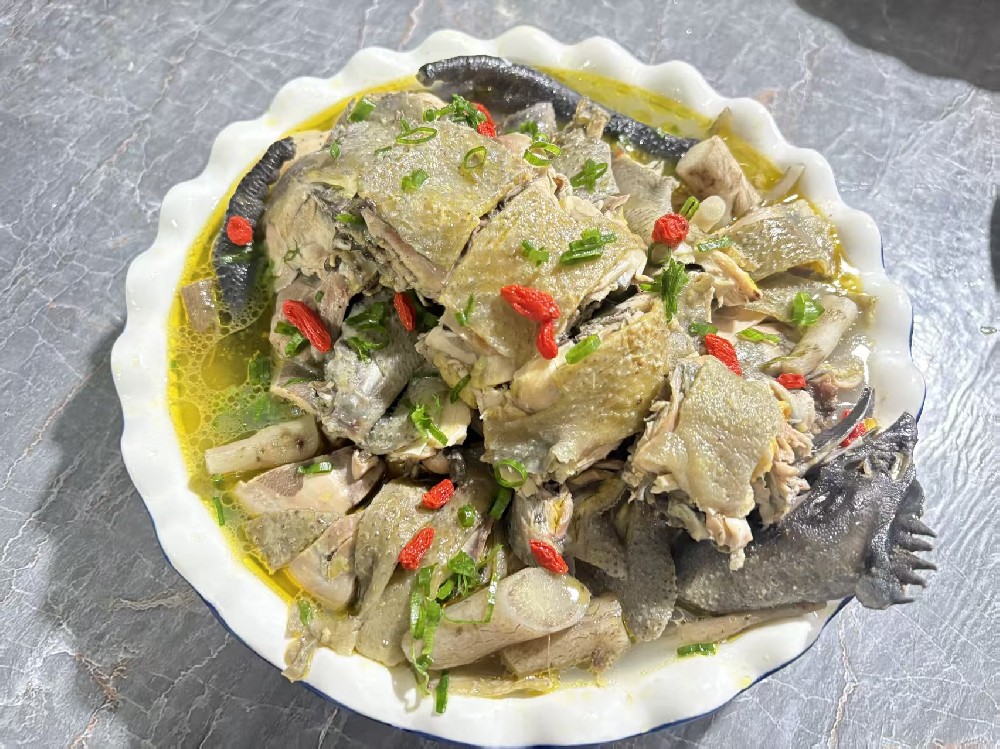 待鸡肉炖至半酥、汤汁渐浓,再放入切好的鸡刺根段,继续以小火焖煮1个小时。此时,鸡刺根充分吸收了瓢鸡汤的醇厚鲜味,又保留着自身独特的清甜与淡淡药香,汤汁金黄透亮,鸡肉软烂脱骨,入口鲜香交织,余味悠长。
