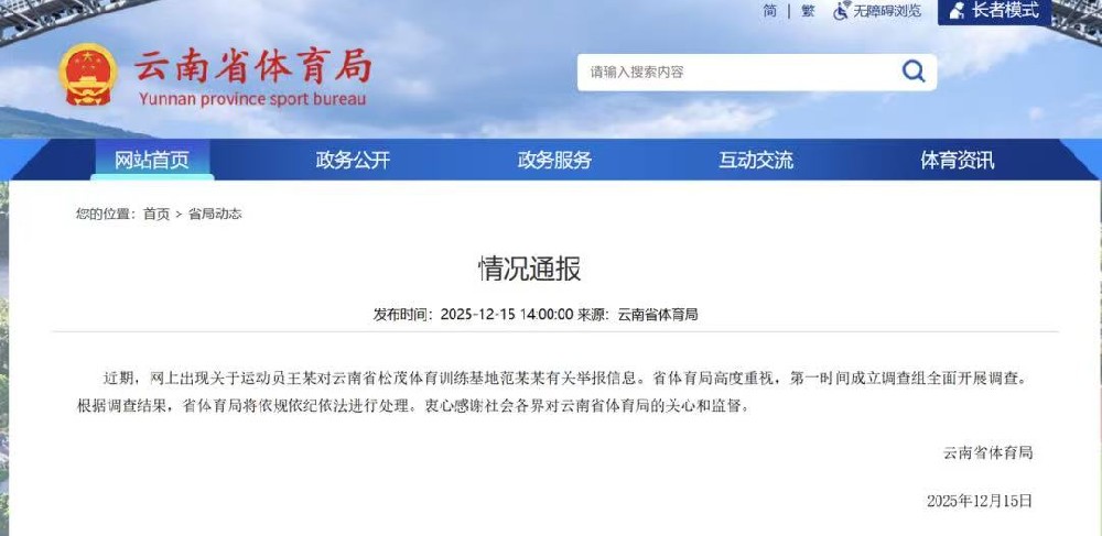 凤凰新闻网络电视台(记者司孟奇黄平)12月15日云南省体育局在官网发布关于“运动员王某视频举报事件”的情况通报。