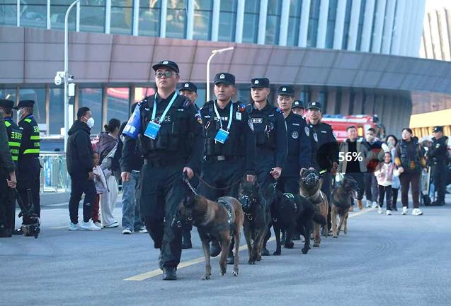 它们身着专属“执勤标识”,与民警组成机动巡逻组,穿梭在人群密集的入口、停车场及周边街道。昂首挺胸的姿态、整齐划一的步伐,配上警惕扫视四周的眼神,尽显巡逻“硬汉”风范,让不法分子望而却步。
