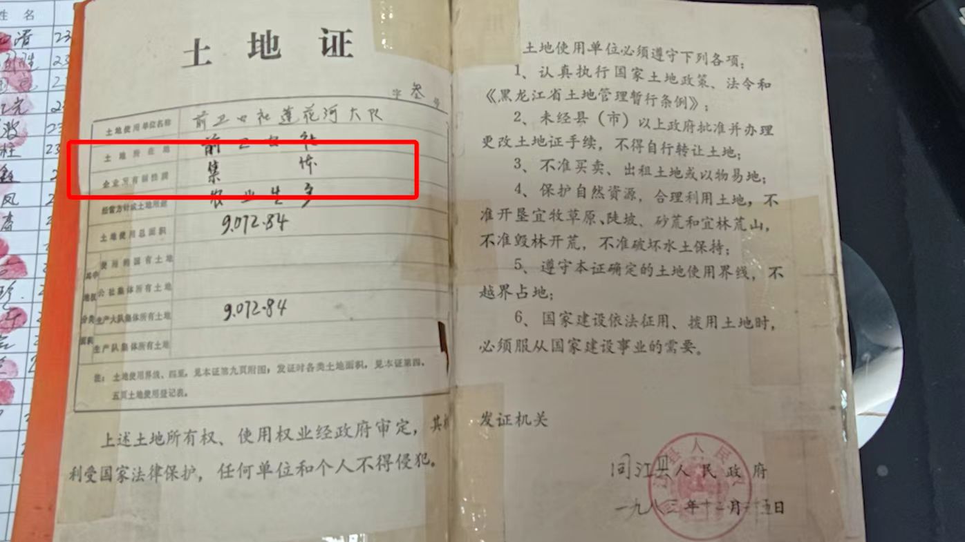“1983年,同江县(现为同江市)政府给我们颁发了土地证,在土地性质一栏,清楚地写着土地性质为集体。”同江市金川乡金江村村民刘玉琴说,之后,人民公社解散,成立乡镇,当时的金川人民公社变成了金川乡,但是土地性质一直没有改变过。实行联产承包责任制后,两轮土地承包中,村民都顺利拿到了由黑龙江省人民政府制发的《土地承包经营权证》。 “土地承包经营权证的使用须知第一条就明确,此证只作农户依法承包集体土地的法律凭证。这也是证明我们的土地属于集体土地的明确证据。”刘玉琴说。