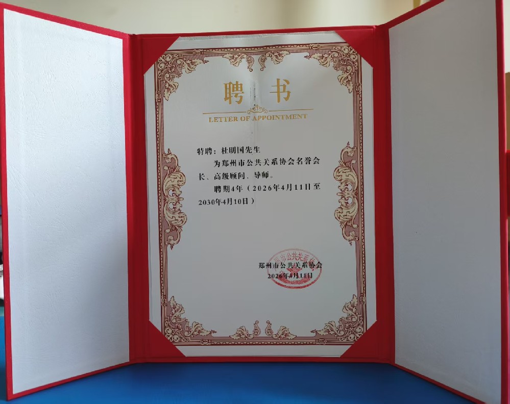 迈入新时代,杜明国教授紧跟时代步伐,主动拥抱数字变革,积极探索数字公关、智慧公关、品牌公关创新路径,持续为政府决策、企业发展、社会治理提供高水平专业咨询。此次受聘郑州市公共关系协会,既是行业对其数十年深耕不辍、潜心治学的高度肯定,也标志着郑州公关事业在专家引领、资源整合、能力提升上迈出新步伐。