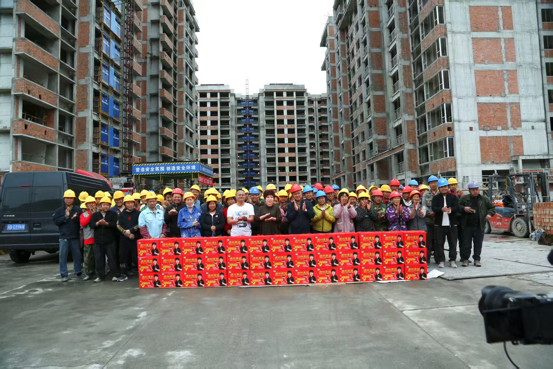 没有顾上休息,燕姐一行人就赶回绵阳涪城区城厢街道建国门社区,社区党委书记蒲陶军,副书记胡玉娟,居委会副主任刘应及工作人员感谢燕姐的多次爱心,并帮忙把节日礼物依次发放给这里的环卫工人和绿化工人,涪城区环境卫生和绿化中心主任冉伟,工会主席吕宗林也参加此次慰问活动。一同感受着这份浓浓的大爱。接着燕姐又匆忙赶往涪城区石塘街道范家片区城中村改造项目工地,涪城区住建局综合执法股罗小平及项目管理人员李愽希在工地大门口等候燕姐一行人的到来,燕姐为奋战在这里的农民工送上节日礼盒,感谢他们为城市建设付出的辛苦和贡献!祝福他们身体健康!节日快乐!
