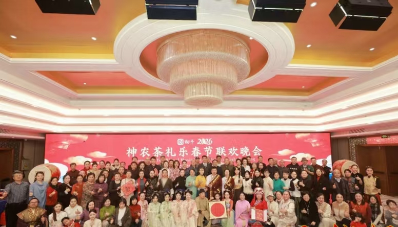 由中华文化促进会茶产业工作委员会、中国商业文化研究会商业品牌工作委员会、中国非物质文化遗产研究网联合指导,神农茶礼乐春晚组委会主办,嘉石木集团、相予茶礼乐艺术团承办,北京市昌平区德方育华学校、莫说茶文化协办的2026第二届神农茶礼乐春节联欢晚会,在北京朝阳区中传国际交流中心盛大启幕。全国各省代表、各行各业精英与海内外500余位嘉宾齐聚一堂,以“两片树叶一把土”的东方智慧为引——茶叶、桑叶与陶瓷茶器交织,18种风格茶席美学现场竞艳,席主亲自主泡、品茶赏春晚的沉浸式体验拉满氛围,茶美学空间展示、汉服打卡、太极展演、封茶大典相映成趣,马年茶春晚吉祥文创惊艳亮相,茶做红包千福齐发,将春节喜庆推向高潮。众人在茶香礼乐中践行“因茶而聚,因乐、因礼、在一起而美好”的初心,奏响“民族自信,天下大同”的新春乐章。