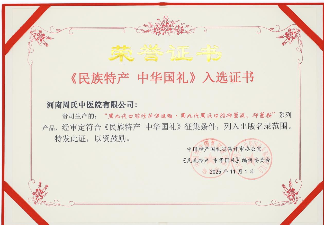 依托非遗核心验方,周氏中医世家全新打造周九代口腔咽喉系列:口腔修护保健贴、周氏口腔抑菌液、周氏口腔抑菌粉。产品以古法草本为内核,聚焦黏膜修护、咽喉舒缓、抑菌护理,兼顾日常养护与不适缓解,全程合规质控、安全可溯。2025年11月,经中国特产国礼征集评审办公室、《民族特产·中华国礼》编辑委员会联合审定,该系列正式入选中华国礼出版名录,并获评中央和国家机关老干部团拜会指定礼品,成为中医药非遗口腔成果的国家级认可。