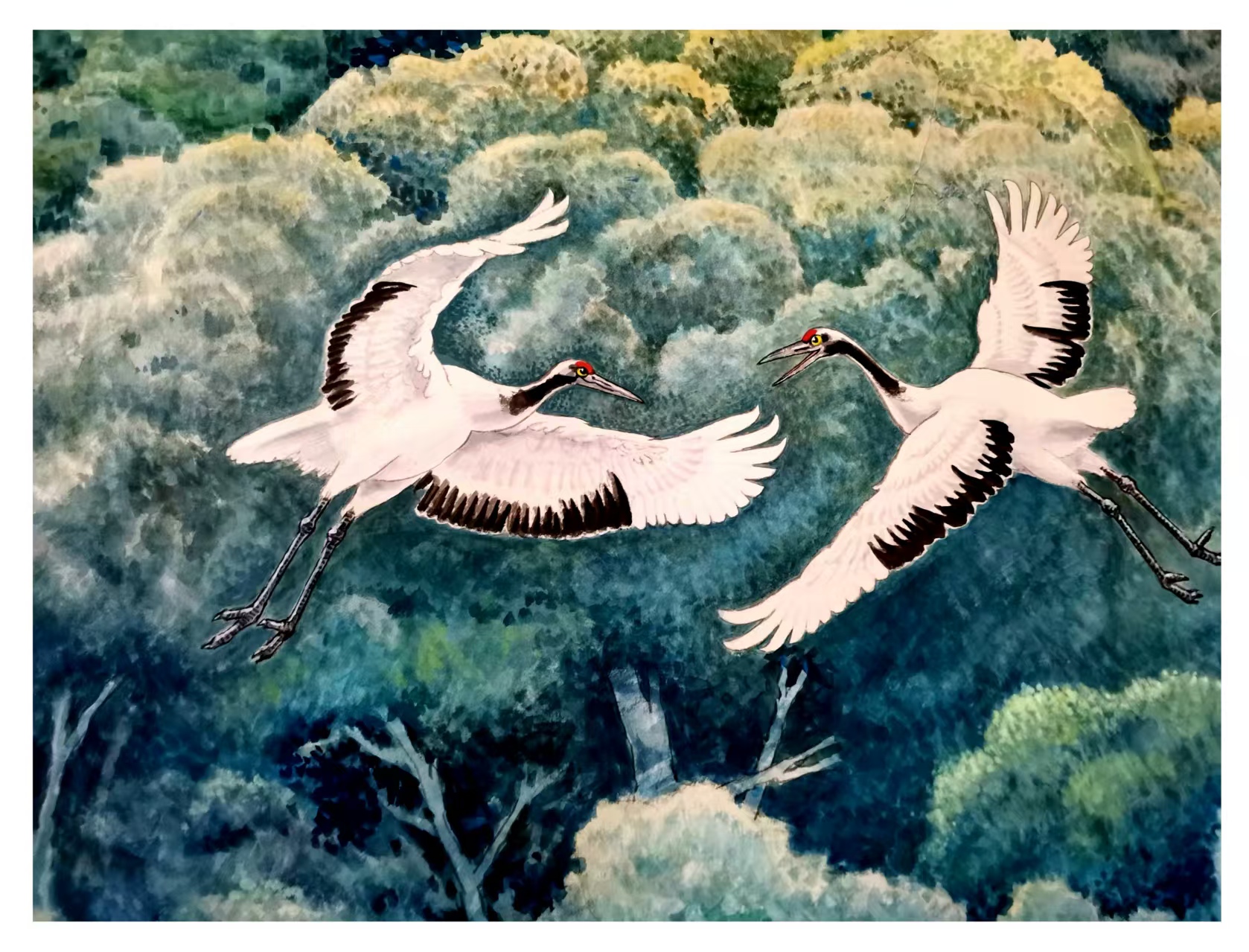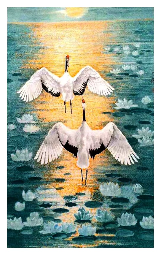 该作以宏大叙事与精湛技法走向国际。群鹤翱翔于高耸在祥云瑞气之间的华表周边,构图开阔舒展,色彩富丽典雅,鹤群的动态组织疏密有致、气脉贯通,既体现团结祥和的文化内涵,又展现东方艺术独有的韵律之美。画家以“整体气势撼人,局部细节精妙”的把控力,让作品兼具仪式感与艺术性,成为中外文化交流中极具代表性的精品力作。