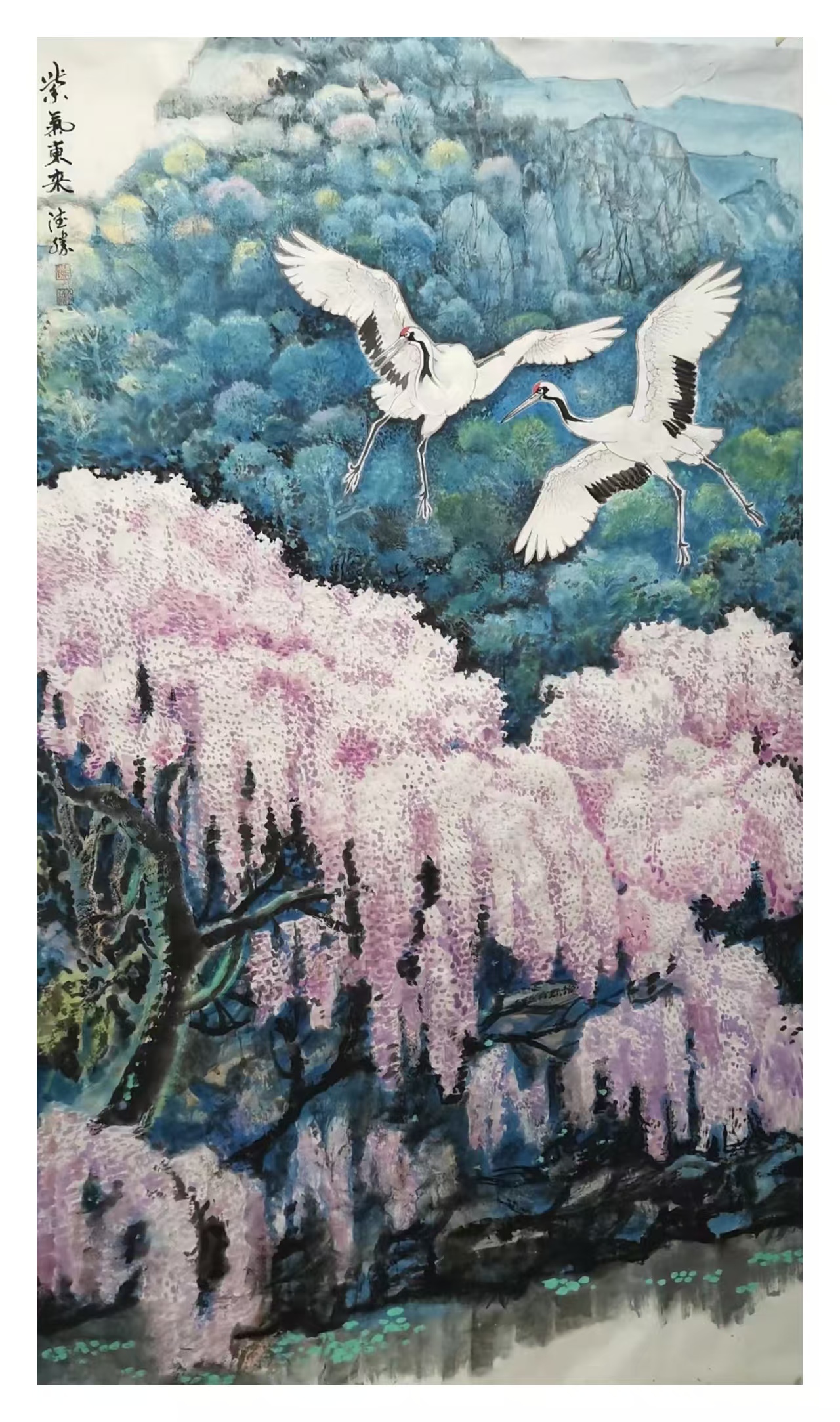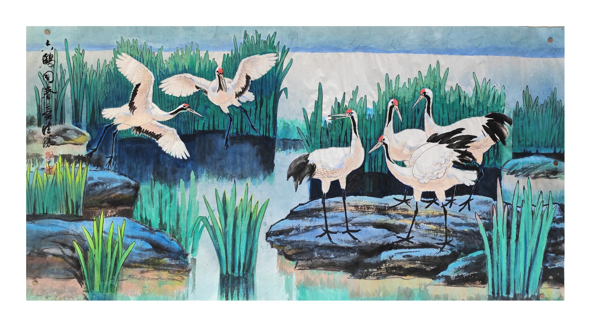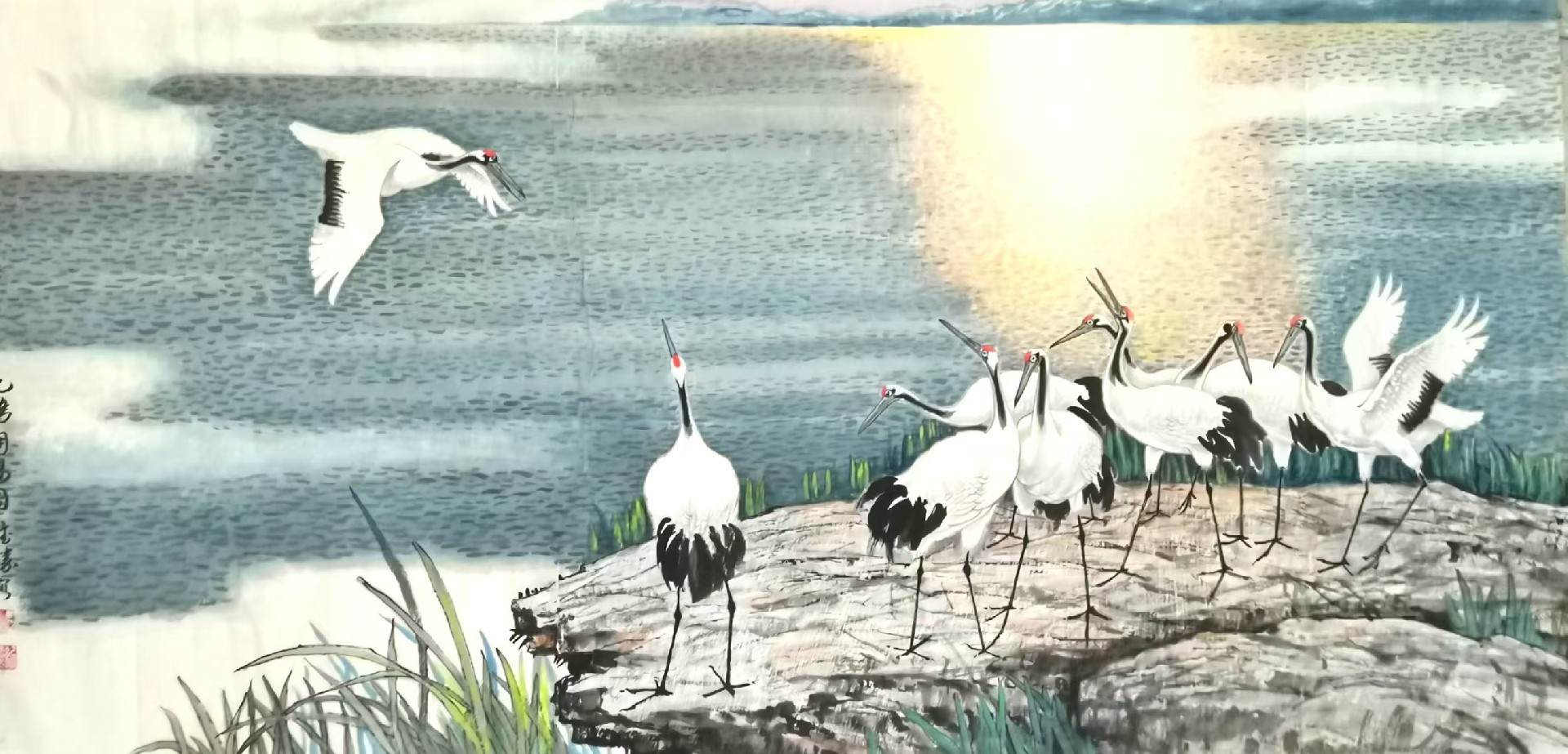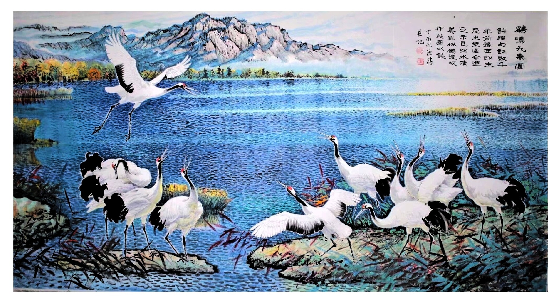 该作为获得中国画名家学术邀请展一等奖的代表作,以严谨构图与和谐色彩成为经典力作。画面中十只仙鹤流连于碧水青山之间,或昂首迎霞,或低首理羽,或伫立观云,或漫步松间,顾盼呼应、姿态各异,形成完整的生命叙事。画家以重彩铺染春日云霞、苍山粼波,石青与朱砂冷暖相映,山下丛林与岛岸草丛远近相宜、蓬勃茂盛,鹤身则以留白与淡墨体现羽毛质感,重色与留白互衬,精工与写意共生,将《诗经》中述说的数千年前豫西曾有的生态仙境呈现在读者面前。作品不仅有深刻的历史文化寓意,又弘扬了时代精神,更具备极高的形式美感,是传统吉祥题材当代转换的典范之作。