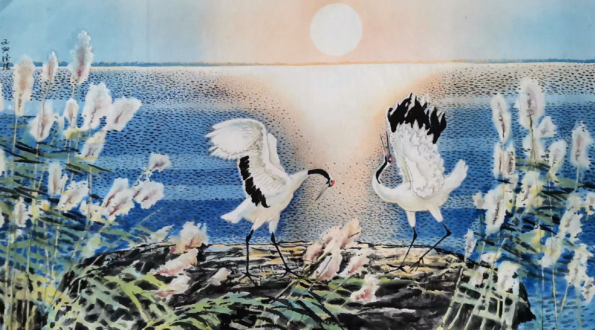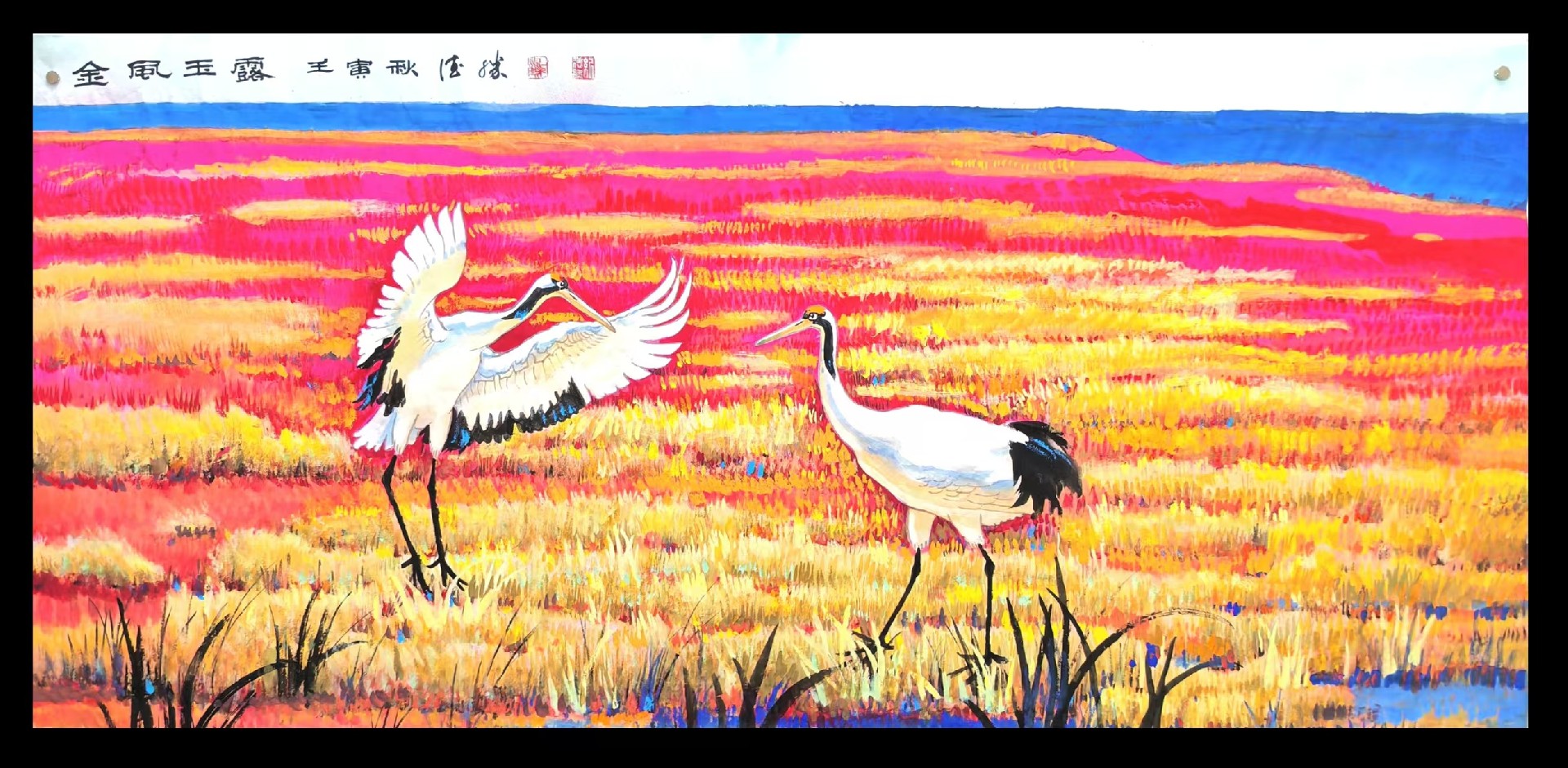 在《金风玉露》中,作者独出心裁地将绝大部分画面绘制为重彩,画边沿一圈蓝色的水面环绕着艳如血火的土地,金灿灿的草地上,两只仙鹤忘情起舞。整幅画作通过高饱和度的色彩撞染构建出极具视觉冲击力的现代构成,以蓝、红、金的强烈色相对比重构了自然意象,赋予传统仙鹤题材以鲜明的视觉张力。画面中,仙鹤的灵动机敏与背景大地的苍茫厚重形成刚柔互衬,金色草地的富丽华滋与血色土地的沉郁苍茫互为表里,实现了形式美感与精神内涵的深度统一。这种以重彩语言重构诗意空间的尝试,不仅打破了传统鹤画清雅温润的固有范式,更标志着纪德胜在当代艺术语境下,对于“重彩写意”这一学术命题的深度探索与成熟实践。