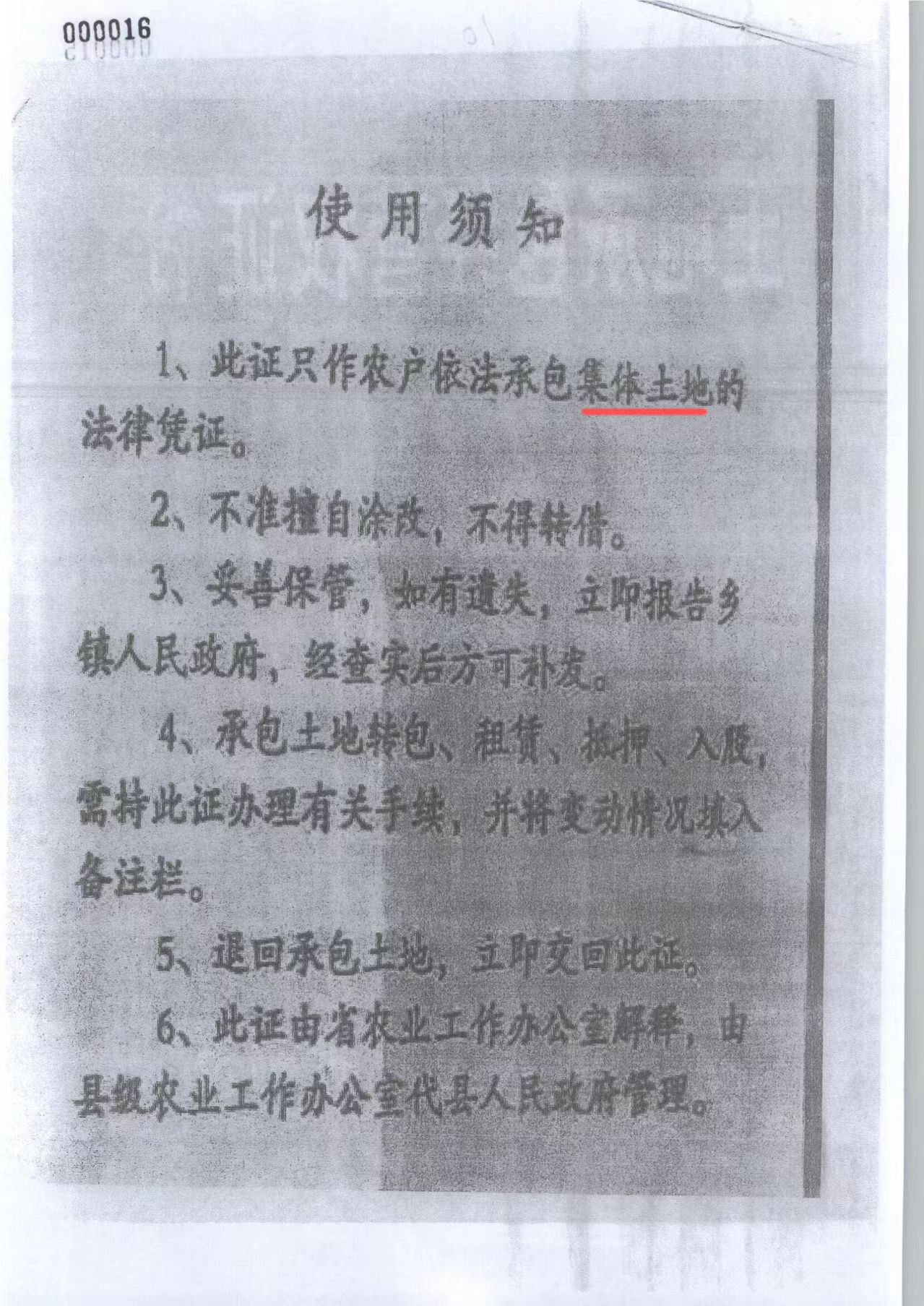 “1983年,同江县(现为同江市)政府给我们颁发了土地证,在土地性质一栏,清楚地写着土地性质为集体。”同江市金川乡金江村村民刘玉琴说,之后,人民公社解散,成立乡镇,当时的金川人民公社变成了金川乡,但是土地性质一直没有改变过。实行联产承包责任制后,两轮土地承包中,村民都顺利拿到了由黑龙江省人民政府制发的《土地承包经营权证》。 “土地承包经营权证的使用须知第一条就明确,此证只作农户依法承包集体土地的法律凭证。这也是证明我们的土地属于集体土地的明确证据。”刘玉琴说。