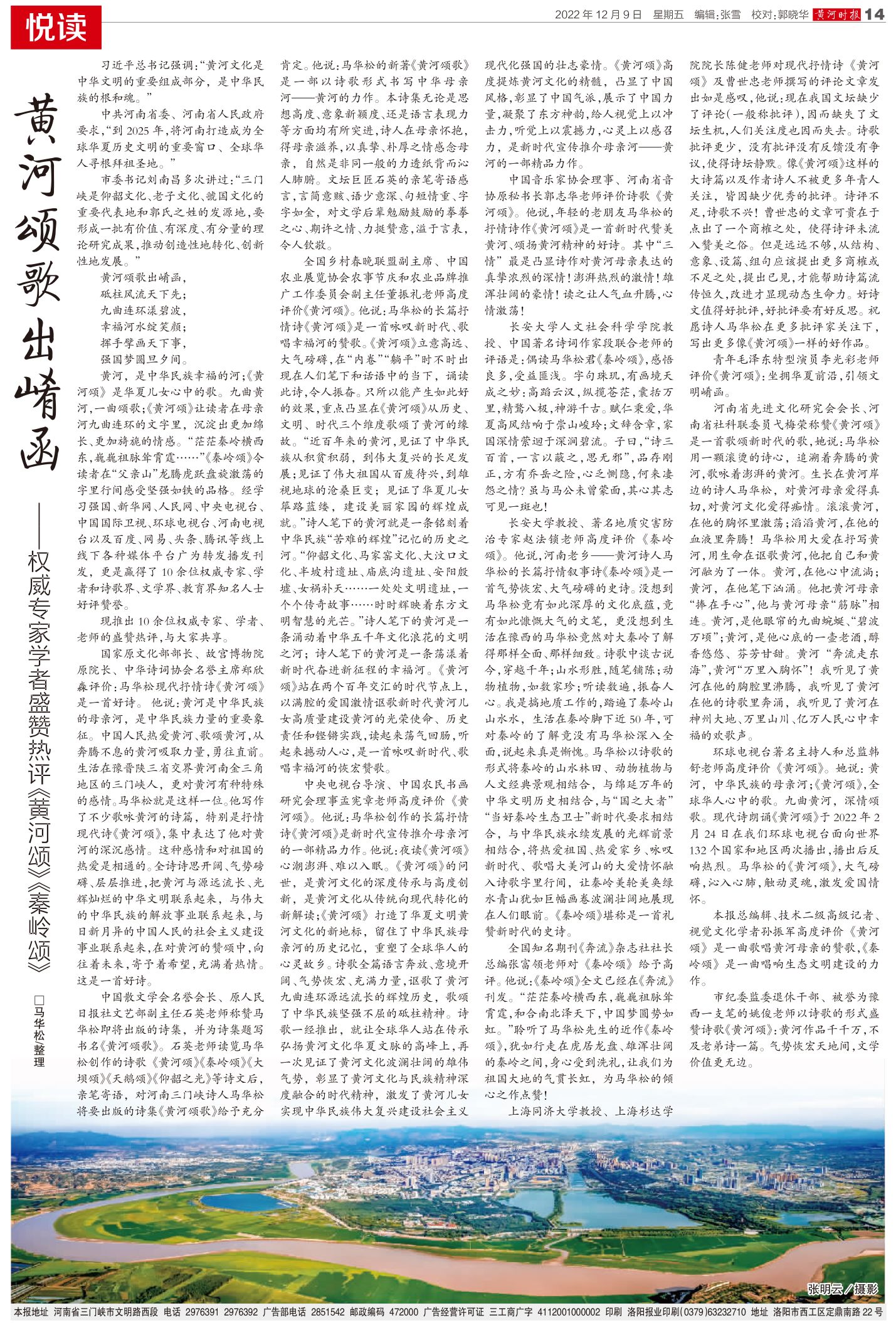 放眼周边的文化人,细思祖国的伟大诗人,在三门峡、在河南、在全国,有几位才人敢来抒写黄河!有几位才人能将九曲连环的黄河、桀骜不驯的黄河、奔腾咆哮的黄河,苦难深重的黄河,流淌千年的黄河、文明灿烂的黄河、生态秀美的黄河……融汇在一首仅有千字的诗歌之中!